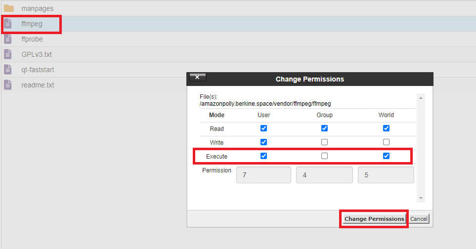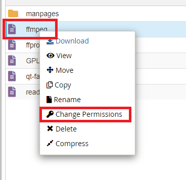 - Step 15: Change file permission of ffmpeg to be executable by anyone.