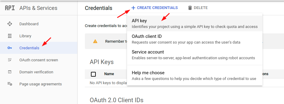 - Step 6: Click the menu button and select Credentials and click Create credentials > API key.