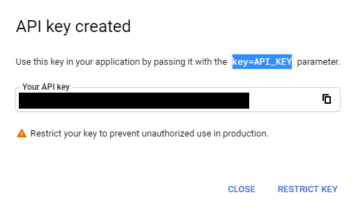 - Step 7: The API key created dialog displays your newly created API key. Copy and paste it as shown in Step 8. The new API key is listed on the Credentials page under API keys.