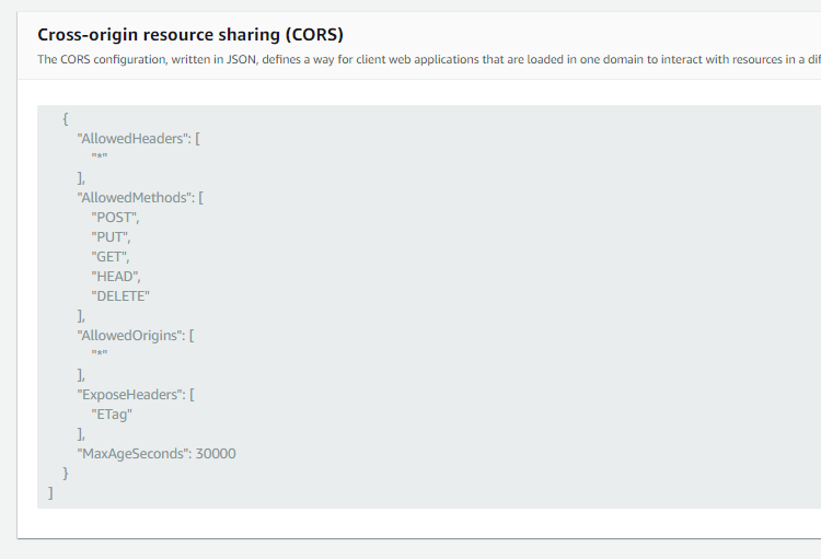 - Step 2: Add CORS settings as shown below in the Permissions -> Cross-origin resource sharing (CORS) Configuration section and click Save.