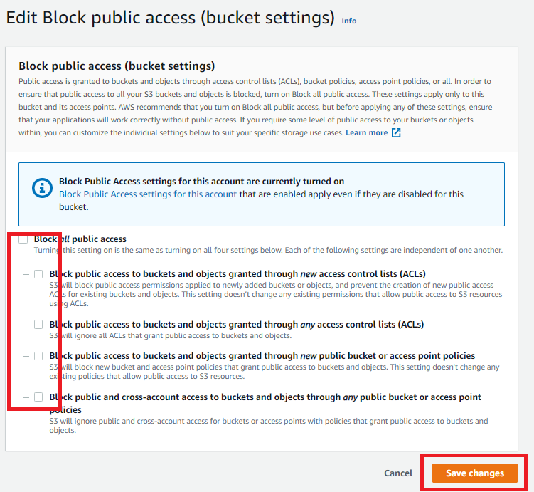- Step 1: Make sure your Permissions -> Block Public Access looks at least like this and has all 4 options turned off.